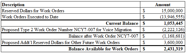 Voice and Security Services, to increase the reserved dollars for work orders